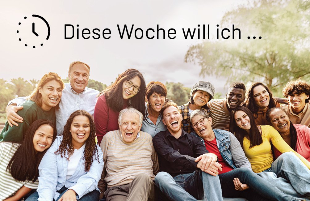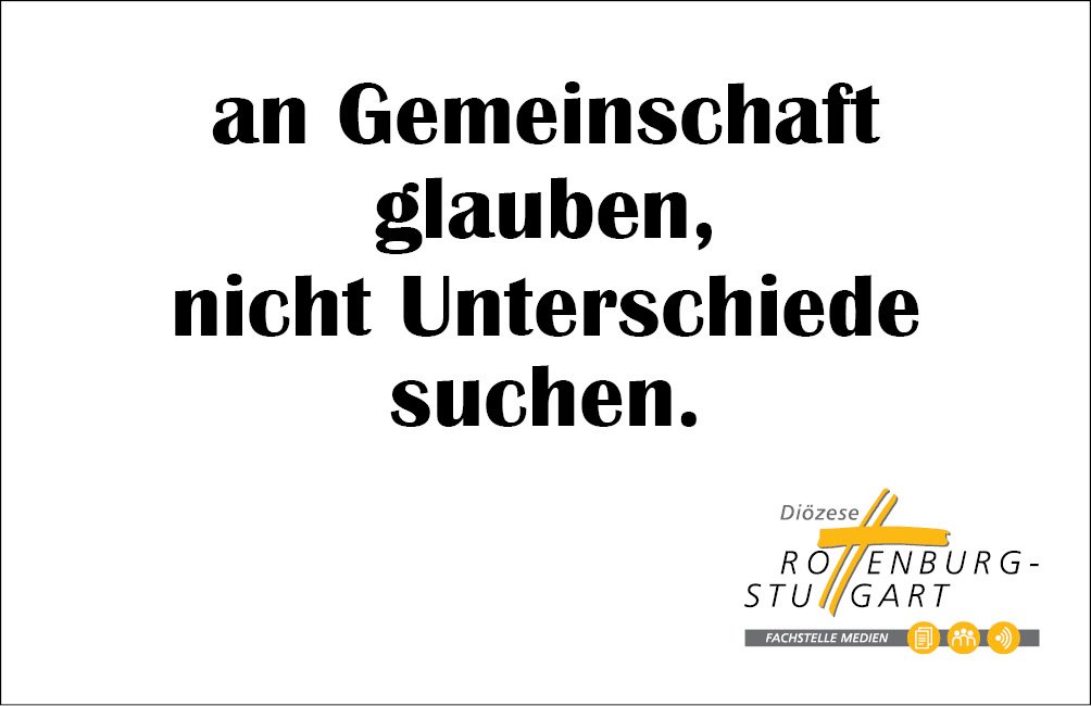 Vorderseite mit einer großen, diversen Gruppe von Menschen. Auf der Rückseite steht "... an Gemeinschaft glauben, nicht Unterschiede suchen."