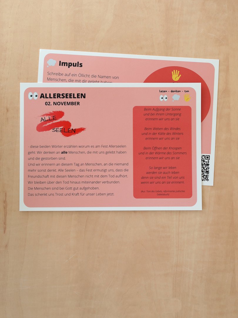 Zu den verschiedensten kirchlichen Feiertagen gibt es Impulskarten, die sich besonders für Familien, aber auch für Ministrantengruppen, Jugendgruppen oder in der Schule eignen. Die Karten erklären den Feiertag, bieten dazu kreative Ideen an, verlinken via QR-Code auf passende Lieder und vieles mehr. Die Karten eignen sich auch für den Einsatz in der Seelsorge bei Menschen mit Behinderung.