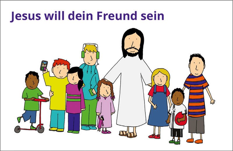 Ein Kärtchen mit abziehbarem Aufkleber zeigt im modernen Stil Jesus und die Kinder unter der Überschrift "Jesus will dein Freund sein!". Gut geeignet für Kindergottesdienste, Schule und Kindergarten. Im Format 8,5 x 5,5 cm (Größe von Visitenkarten) lassen sich die Aufkleber gut auf Schulhefte, Kommunionmappen oder Ähnliches unterbringen.