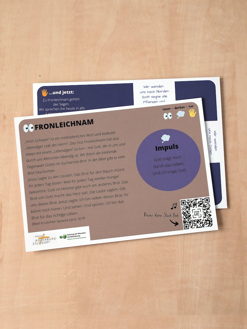 Zu den verschiedensten kirchlichen Feiertagen gibt es Impulskarten, die sich besonders für Familien, aber auch für Ministrantengruppen, Jugendgruppen oder in der Schule eignen. Die Karten erklären den Feiertag, bieten dazu kreative Ideen an, verlinken via QR-Code auf passende Lieder und vieles mehr. Die Karten eignen sich auch für den Einsatz in der Seelsorge bei Menschen mit Behinderung.