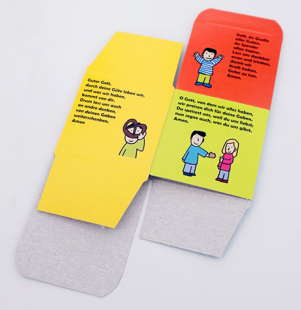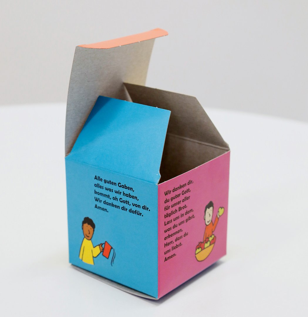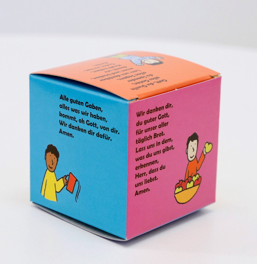 Liebevolle Zeichnungen, sechs einfache Tischgebete, knallbunte Farben und ein handliches Format sprechen Kinder, aber auch Erwachsene an. Nach dem Tischgebet lässt sich der Würfel wieder einfach flach zusammenlegen. So kann er auch gut mit auf Freizeiten oder ähnliche Veranstaltungen genommen werden. Als Faltschachtel eignet sich der Gebetswürfel auch als wiederverwendbare Verpackung für kleine Geschenke.