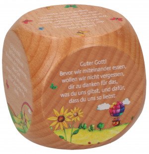 Auf diesem liebevoll gestalteten Gebetswürfel finden sich sechs überlieferte Tischgebete speziell für Kinder. Jedes von ihnen wird von farbenfrohen Illustrationen Mira Gerhards begleitet. Diese zeigen etwa einen Regenbogen, einen Heißluftballon, eine Sonne mit Wolken, oder die Schmetterlinge. Auch ein Hirte mit den Schafen bebildert eine der Würfelseiten. Dabei ziert ein individueller Gebetstext jede Bildszene.
