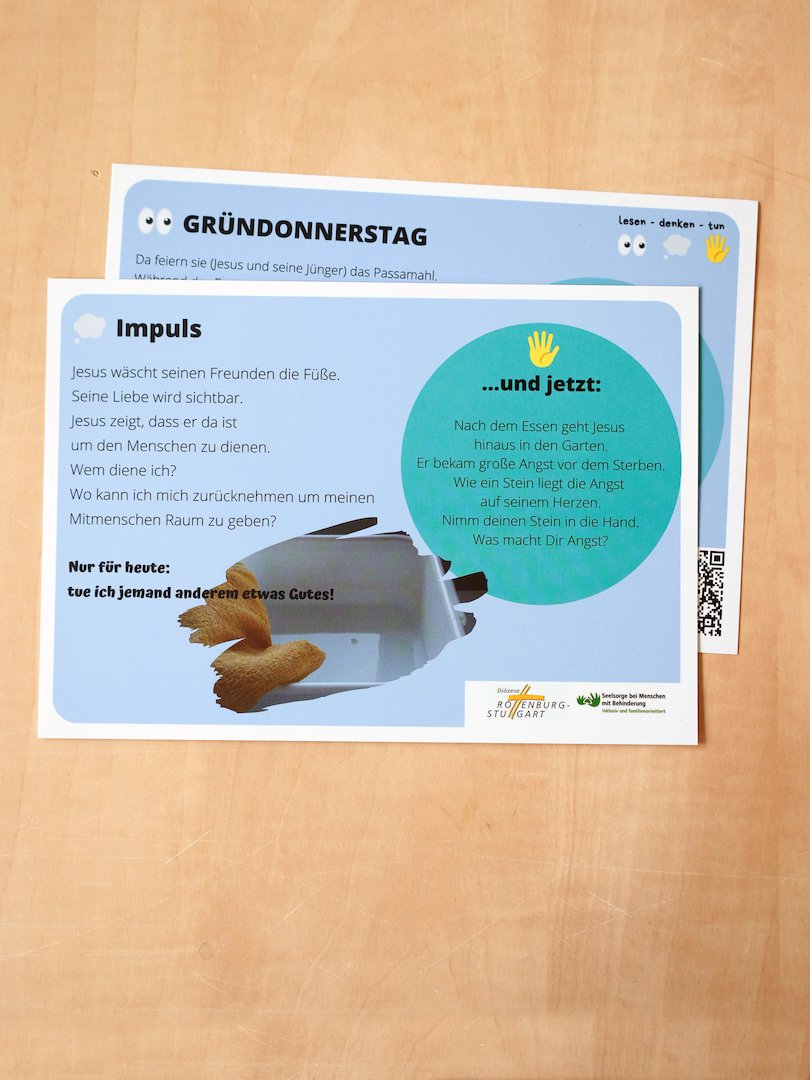 Zu den verschiedensten kirchlichen Feiertagen gibt es Impulskarten, die sich besonders für Familien, aber auch für Ministrantengruppen, Jugendgruppen oder in der Schule eignen. Die Karten erklären den Feiertag, bieten dazu kreative Ideen an, verlinken via QR-Code auf passende Lieder und vieles mehr. Die Karten eignen sich auch für den Einsatz in der Seelsorge bei Menschen mit Behinderung.