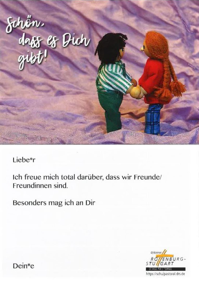 In Postkartengröße gibt es zu der Mitteilung, dass es schön ist, „dass Du da bist“ für Schüler/innen die Gelegenheit, dies anderen gegenüber durch eigene Erinnerungen und Gedanken auszudrücken. Die entsprechende Nachricht kann auf der Rückseite der Postkarte formuliert werden.