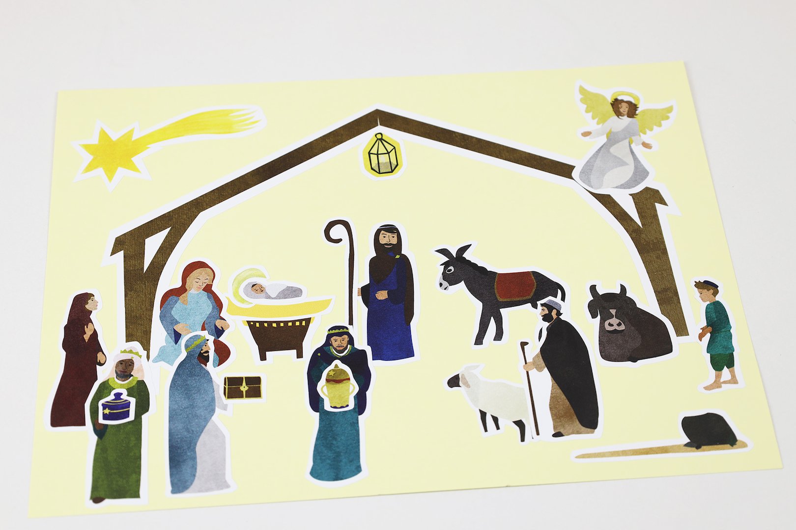 Der überarbeitete Aufkleberbogen besteht aus 24 einzelnen Stickern von Personen, Tieren und Objekten aus der Weihnachtsgeschichte. Jeden Tag kann ein neuer Aufkleber ergänzt werden, bis die Krippenszene zu Heiligabend komplett ist. So wächst bei Groß und Klein die Vorfreude auf das Weihnachtsfest.