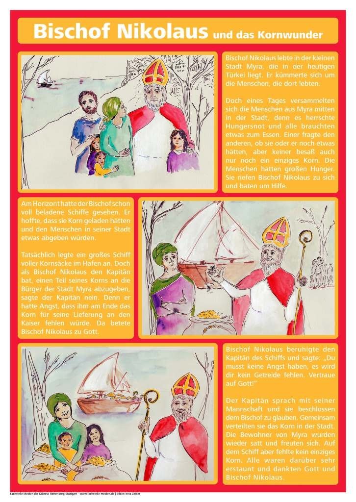 Mithilfe des großen Plakats kann in einem Stuhlkreis die Geschichte von Bischof Nikolaus und dem Kornwunder erzählt werden. In einfachen Worten und Bildern ist zu entdecken, wie Nikolaus mit Gottes Hilfe seine Stadt gerettet hat.