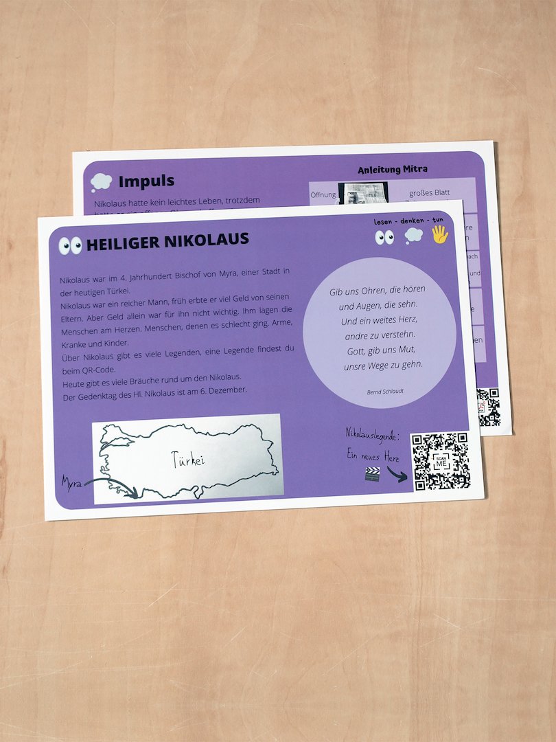 Zu den verschiedensten kirchlichen Feiertagen gibt es Impulskarten, die sich besonders für Familien, aber auch für Ministrantengruppen, Jugendgruppen oder in der Schule eignen. Die Karten erklären den Feiertag, bieten dazu kreative Ideen an, verlinken via QR-Code auf passende Lieder und vieles mehr. Die Karten eignen sich auch für den Einsatz in der Seelsorge bei Menschen mit Behinderung.