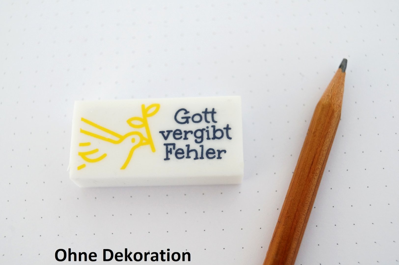 Der Radiergummi ist als kleines Geschenk für unterschiedliche Anlässe geeignet, sei es für Kommunionkinder, Ministranten, Schüler oder andere Kindergruppen. Die Taube als christliches Symbol und der Spruch: "Gott vergibt Fehler" geben das sichere Gefühl von Gott angenommen zu werden.