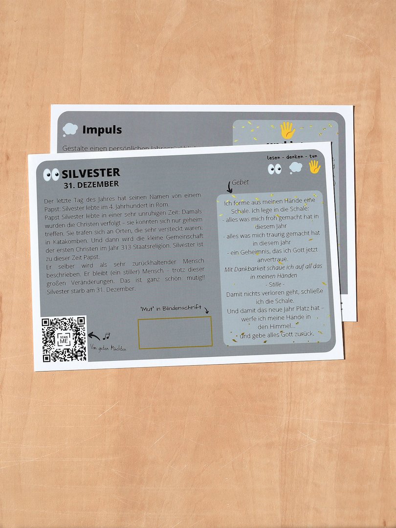 Zu den verschiedensten kirchlichen Feiertagen gibt es Impulskarten, die sich besonders für Familien, aber auch für Ministrantengruppen, Jugendgruppen oder in der Schule eignen. Die Karten erklären den Feiertag, bieten dazu kreative Ideen an, verlinken via QR-Code auf passende Lieder und vieles mehr. Die Karten eignen sich auch für den Einsatz in der Seelsorge bei Menschen mit Behinderung.
